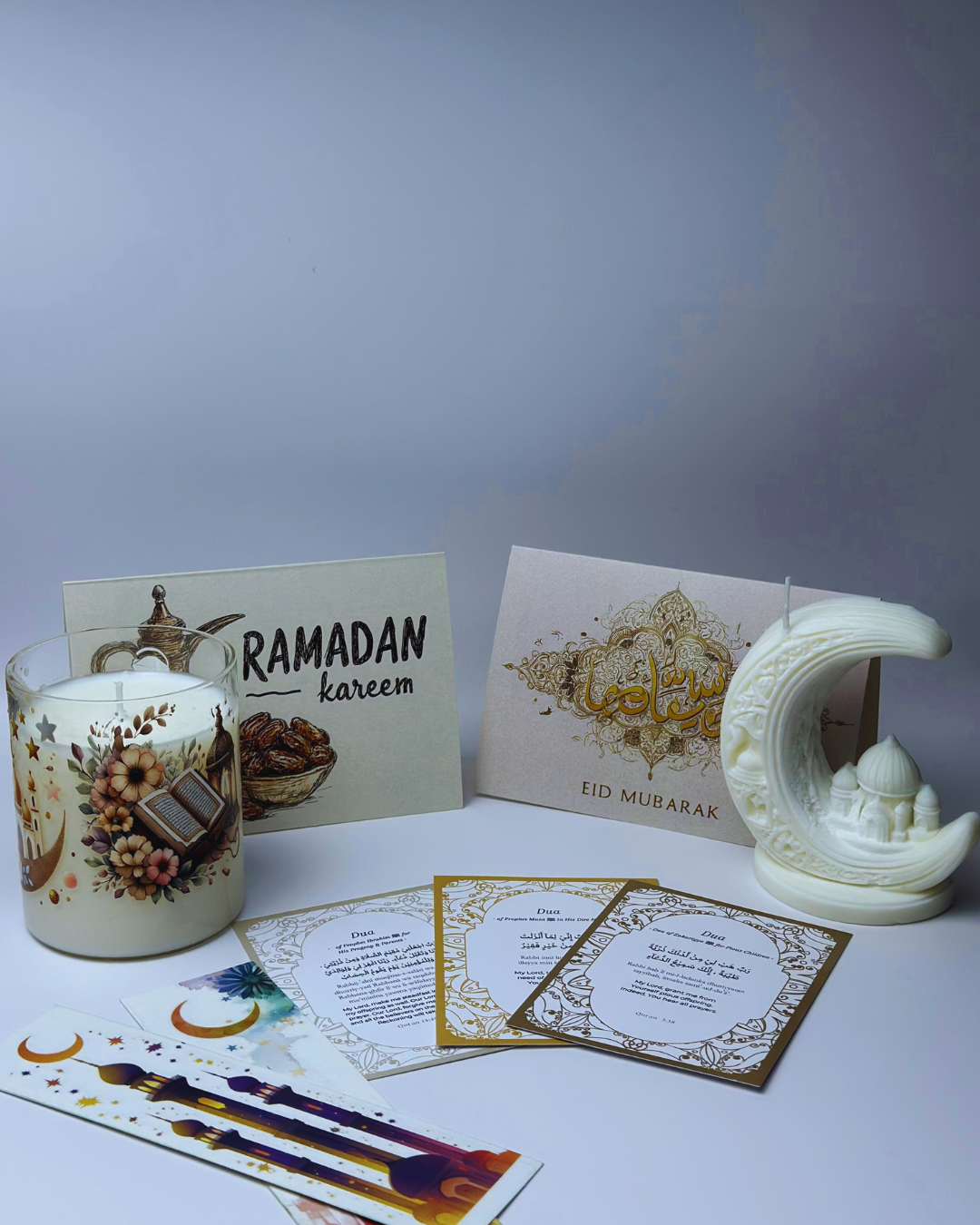 The set features a Ramadan and Eid greeting cards, two scented candles, three carefully selected du’a cards for daily moments of remembrance, and two elegant bookmarks perfect for the Qur’an or Islamic readings. Ideal for personal use or as a heartfelt gift, this set is a gentle reminder to pause, pray, and embrace the blessings of Ramadan and Eid.